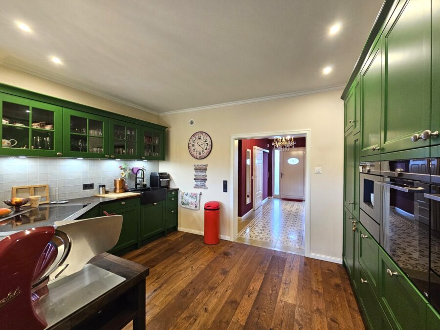 Die angrenzende Küche in edlem Grün begeistert ambitionierte Köchinnen und Köche mit Hightech-Ausstattung und direktem Zugang zur überdachten 45 m² großen Terrasse. Praktisch: Die Speisekammer liegt gleich nebenan.