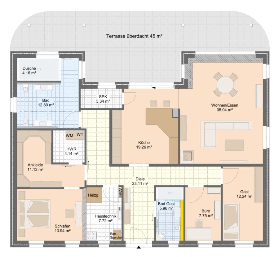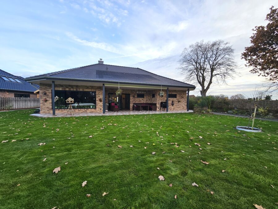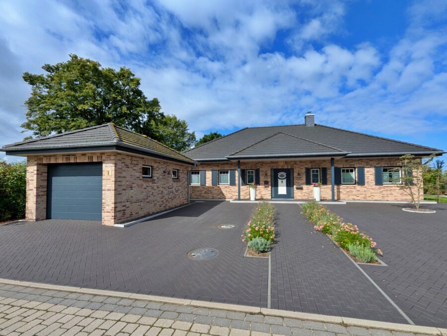 Der großzügige Bungalow in massiver Porenbetonbauweise mit hochwertiger Verblendfassade vermittelt Wertbeständigkeit und ein Gefühl von Geborgenheit.