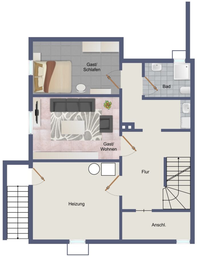 Im UG haben Sie Platz für allerlei Wichtiges wie Wäsche, Räder & Werkzeug, aber sogar auch für eine schicke Bar auch ein weiteres helles Wohnschlafzimmer mit guter Deckenhöhe sowie einem kleinen Duschbad. Tipp: Gestalten Sie die (schlichten) Kellerflure mit schönem Licht, aufregenden Schwarz-Weiß-Fotos und edlen Teppichen als Wohnbelebnis.