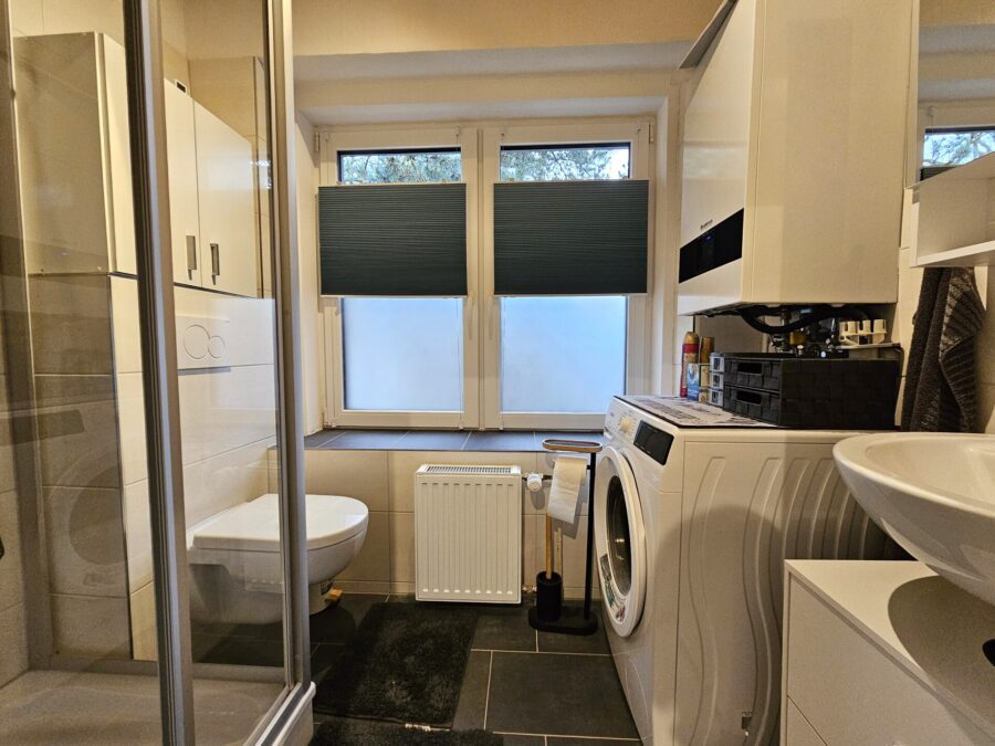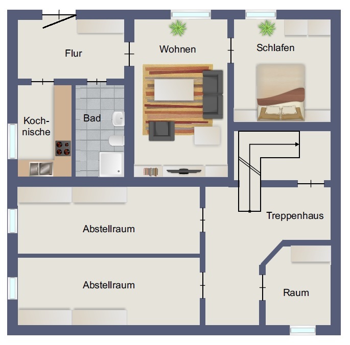 Kompakte und gut geschnittene Einheit mit Flur, Kochnische, Duschbad, Wohn- und Schlafzimmer sowie Kellerabstellraum.