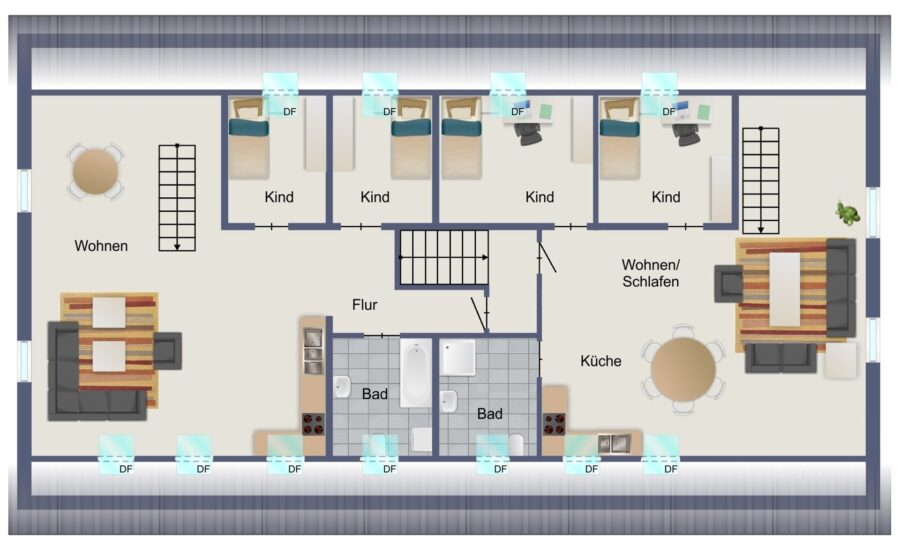 Familienfreundliche Wohnung mit Bad, Kochnische, Wohn-/Schlafbereich, zwei Kinderzimmern sowie ausgebautem Spitzboden.