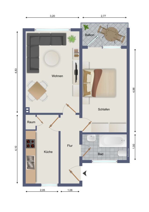 Wir möchten Ihnen hier eine Wohnung im 1. Obergeschoss zeigen, deren 2 Zimmer sich auf rund 46 m² Wohnen verteilen.